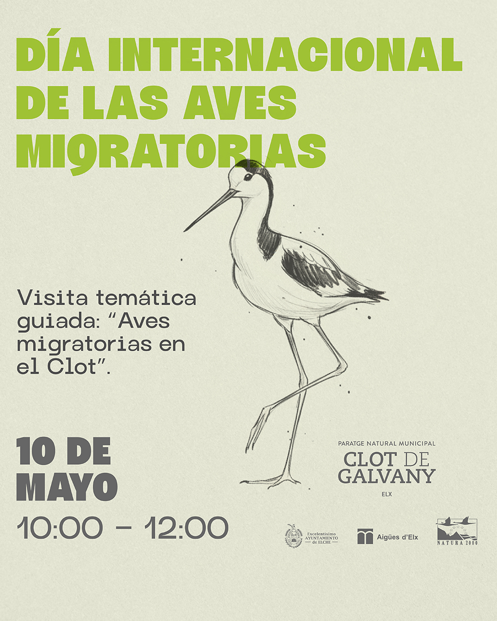 Hora de inicio 10:00, duración 2h. Visita temática guiada: “Aves migratorias en el Clot”. Los monitores guiarán al visitante a través de un paseo por el paraje destinado a observar, identificar y estudiar la conducta de las aves migratorias que nos visitan en esta época, muchas de las cuales llegan con intención de reproducirse, por lo que es posible que se observen “paradas nupciales”, nidos y quizás los primeros pollos de las aves más “madrugadoras”. Las observaciones durante la visita permitirán entender cómo se adaptan las aves a su entorno y el sentido de las migraciones como sistema de adaptación. Se facilitarán prismáticos y guías de aves a los que no posean este tipo de material, y los monitores portarán telescopios para facilitar la observación.