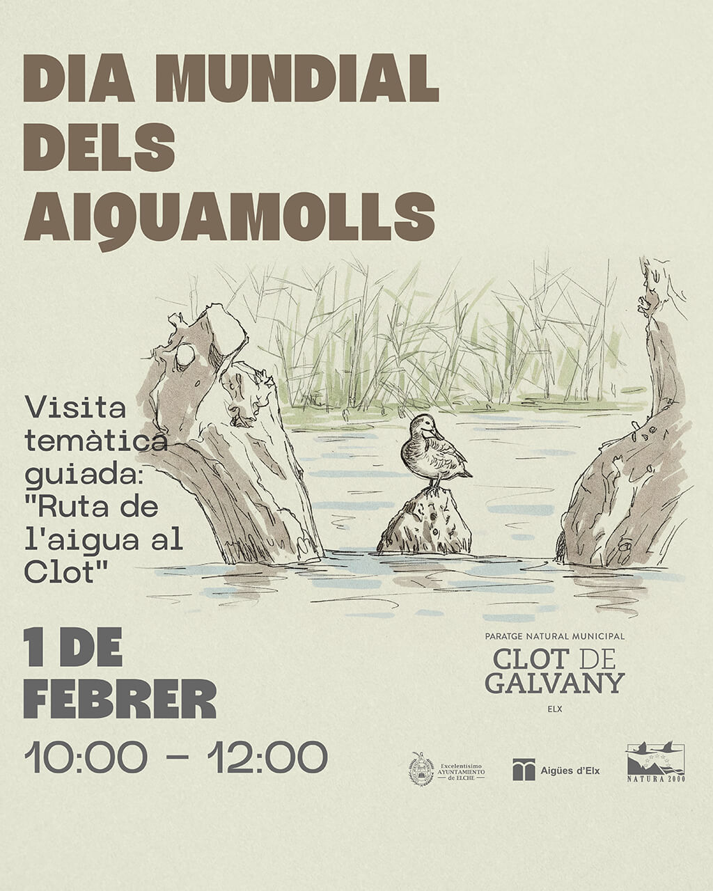 Hora d’inici 10.00 duració aprox. 2h. Visita temàtica guiada: “Ruta de l’aigua en el P.N.M. del Clot de Galvany”. Destinada a conéixer el cicle natural de l’aigua en el paratge i la intervenció humana en el mateix dins del Pla de Gestió del paratge, per a assegurar la permanència de l’aiguamoll. Ocasió per a conéixer els diferents camins que pren l’aigua per a arribar a l’aiguamoll, el paper que juga l’ésser humà en el procés i en concret en el paratge i com es presenta l’aigua en l’aiguamoll. Així mateix, durant la ruta els participants podran aprendre a identificar les espècies de fauna més comunes en els aiguamolls il·licitans, analitzar la seua importància en el manteniment dels processos ecològics essencials i conéixer les labors de gestió que realitzem en el Clot per al seu seguiment i estudi.