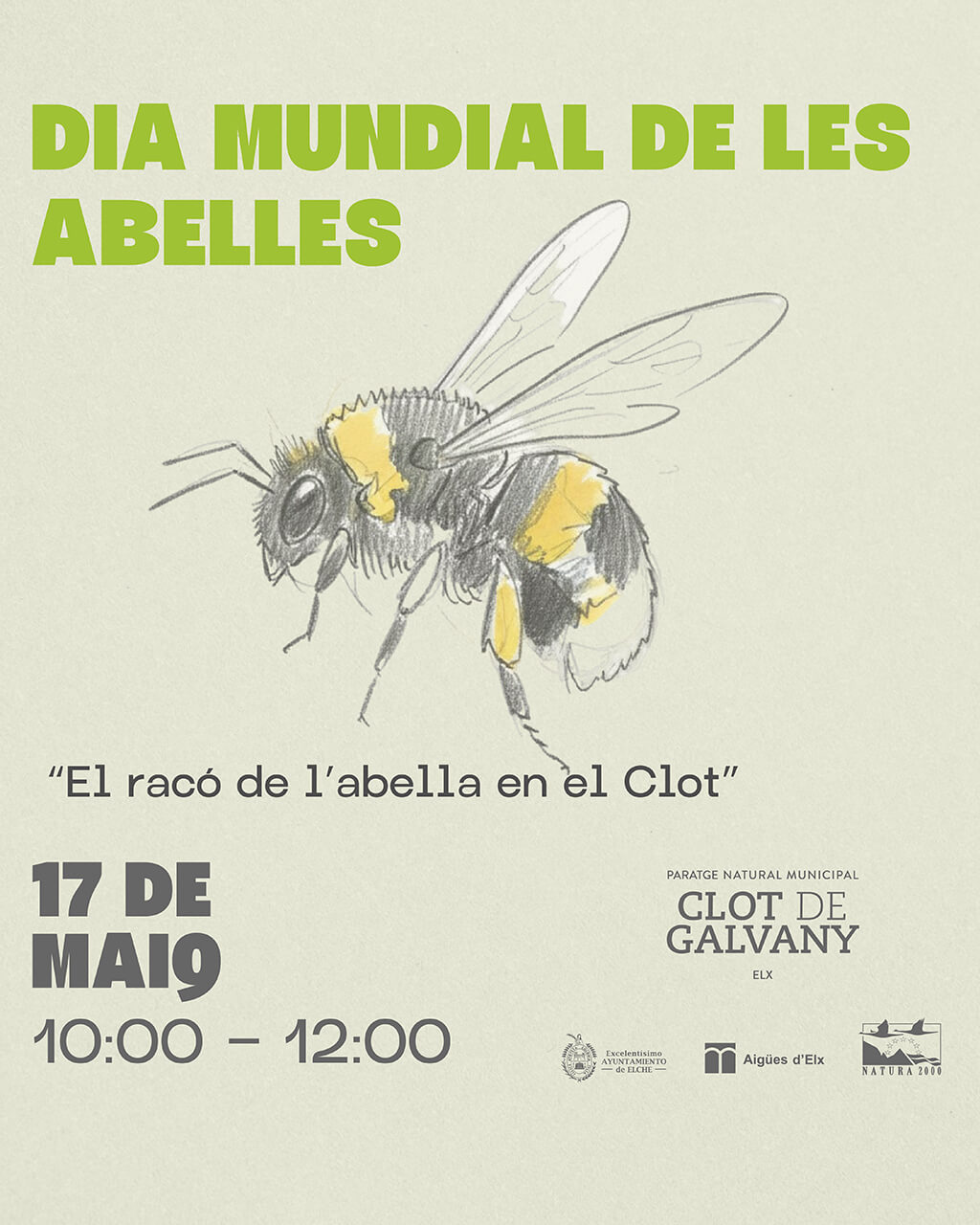 Hora d’inici 10.00, duració aprox. 2h. “El racó de l’abella en el Clot”. Conjunt d’activitats, especialment dissenyades per a grans i xicotets, a través de les quals es podrà descobrir l’important paper que juguen les abelles en la naturalesa, així com per a mantindre activitats tan importants per a la Humanitat com l’agricultura o la pròpia salut humana. D’aquesta manera es podrà observar l’interior d’un rusc amb abelles i la seua frenètica activitat de manera segura a través d’un cristall, fer tallers de maquillatge i pintura, elaboració de productes a partir de la cera generada per les abelles, una divertida caça fotogràfica de les diferents espècies silvestres d’abelles existents en el Clot, o participar en un singular mercat ambulant de productes derivats de l’activitat de les abelles.