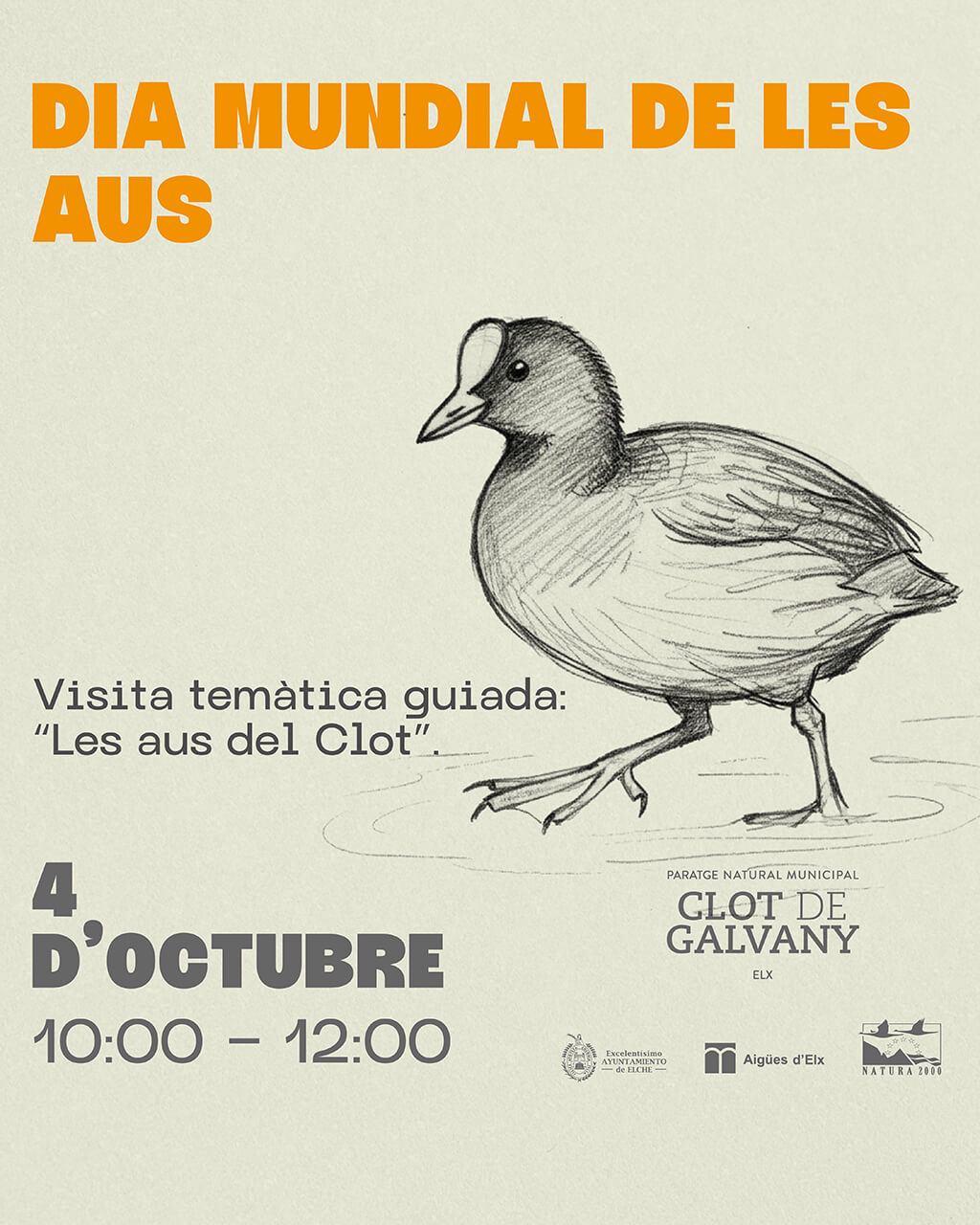 Hora d’inici 10.00, duració aprox. 2h. Visita temàtica guiada: “Els ocells del Clot”. Per a aquells que no posseïsquen prismàtics o guies d’ocells, el personal del paratge els prestarà aquest material amb el qual, guiats i assistits pels monitors, podran observar i identificar, en plena naturalesa, la gran varietat d’ocells que existeixen en el paratge. Al llarg del recorregut es realitzarà una visita a l’estació d’anellament científic d’ocells per a conéixer i observar aquesta tasca d’estudi i seguiment de xicotets ocells i d’aquesta manera tindre l’oportunitat d’observar de prop a determinades espècies la detecció i la identificació de les quals en el camp pot ser difícil.