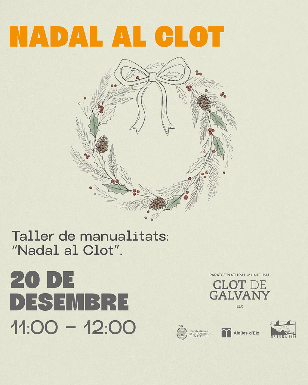 Hora d’inici 11.00, duració aprox. 1h. Taller de manualitats (adorns de Nadal): “Nadal en el Clot”. Aprén amb nosaltres a confeccionar adorns de nadal amb materials reciclables o reciclats i ajuda’ns a decorar el nostre arbre de nadal i omplir-lo de bons desitjos perquè en l’any vinent cuidem millor el nostre planeta. Mentre treballem, reflexionarem sobre els beneficis ambientals del consum responsable i com afavoreix la conservació d’espais com el Clot de Galvany.