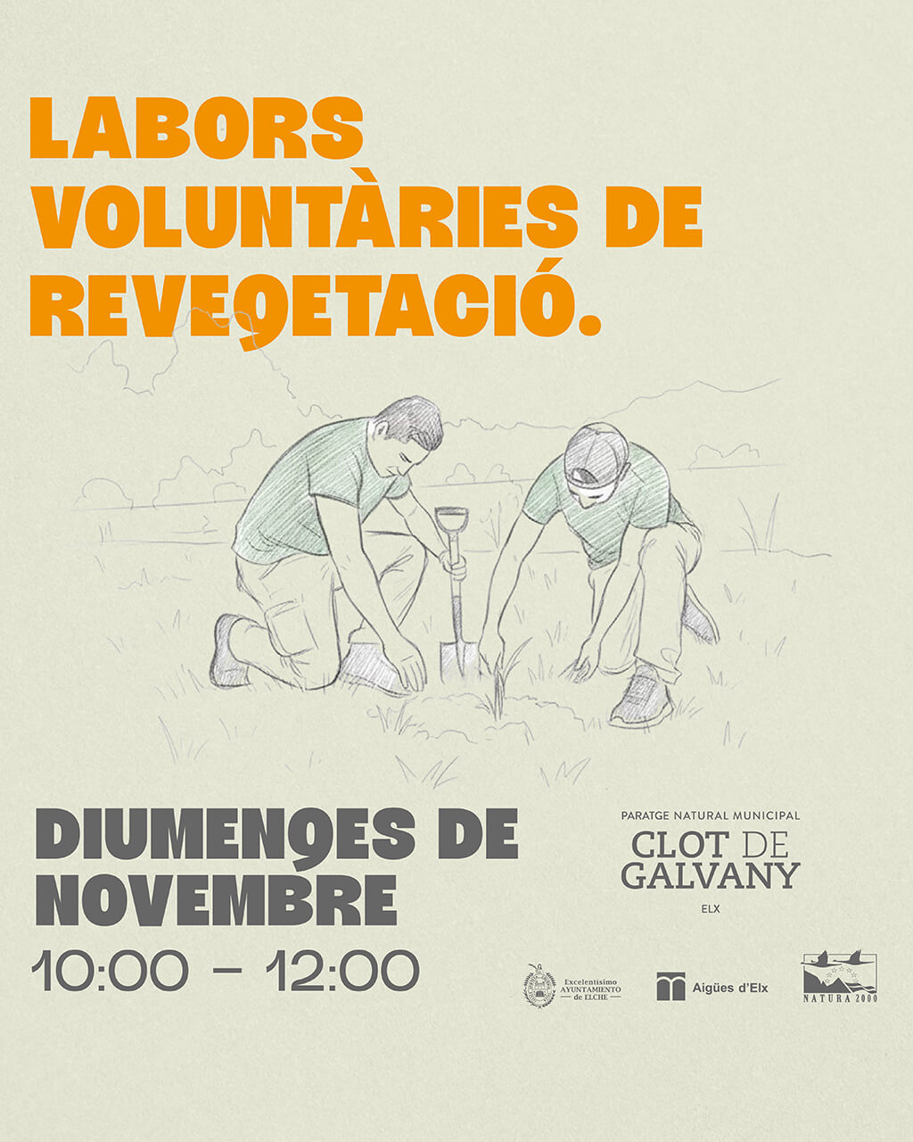 Com és habitual en els últims anys, els diumenges de novembre els dedicarem a les labors de voluntariat per a la revegetació del paratge amb les plantes produïdes en el nostre viver forestal. Aquesta activitat és pròpia del paratge i la data respon tan sols a qüestions pràctiques de major garantia per a la supervivència del repoblat. Com sempre, es tracta d’aprofitar la jornada per a informar de les labors de recuperació de la coberta vegetal natural del paratge i la seua importància dins del Pla de Gestió del Clot, alhora que s’ofereix l’oportunitat de col·laborar amb la recuperació i conservació del paratge a través de la tasca voluntària de plantació.